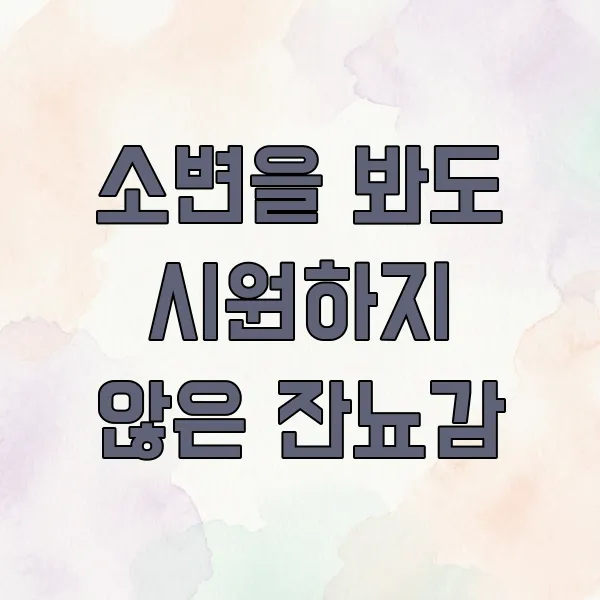 소변을 다 봤는데도 불구하고, 뭔가 시원하게 다 비워지지 않은 듯한 느낌, 즉 잔뇨감 이 남는 것도 오줌 소태의 특징적인 증상 중 하나랍니다. 방광이 완전히 비워지지 않은 것처럼 계속 불편한 거죠.